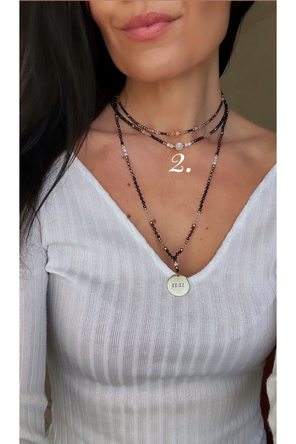 Dámský náhrdelník z minerálů - Roční vibrace roku 2026 - Granát 3 mm, Spinel 3 mm, Měsíční Kámen 3 mm a 8 mm, Sluneční kámen 3 mm, Křišťál 3 mm, Pyrit 3 mm ( náhrdelník č. 2 )