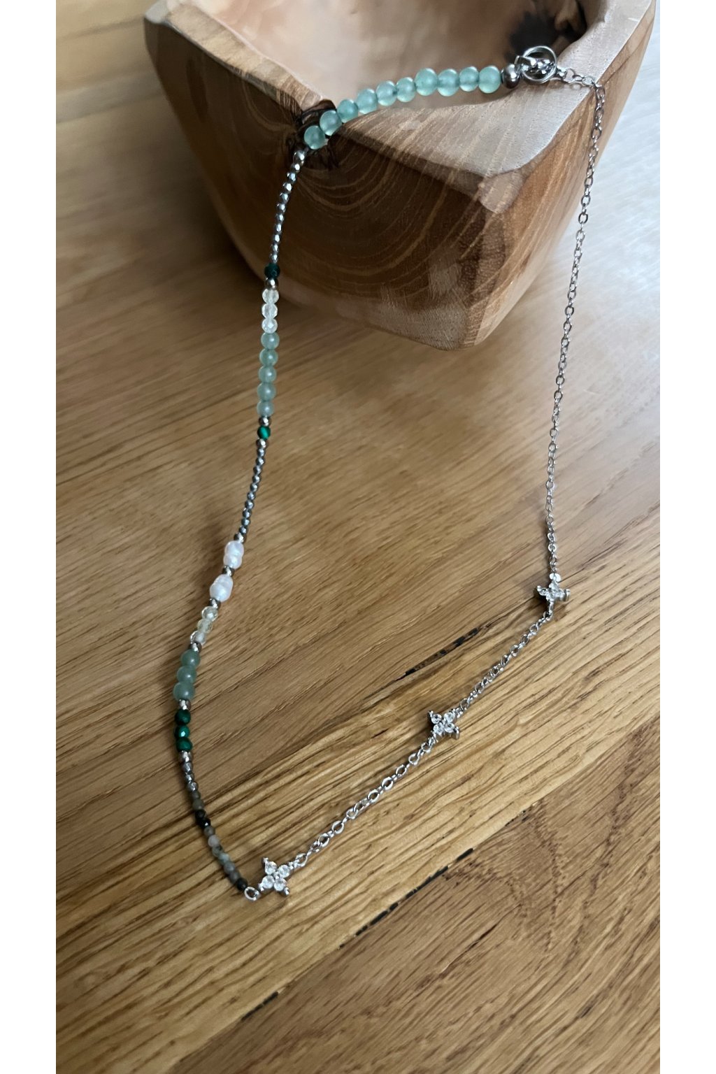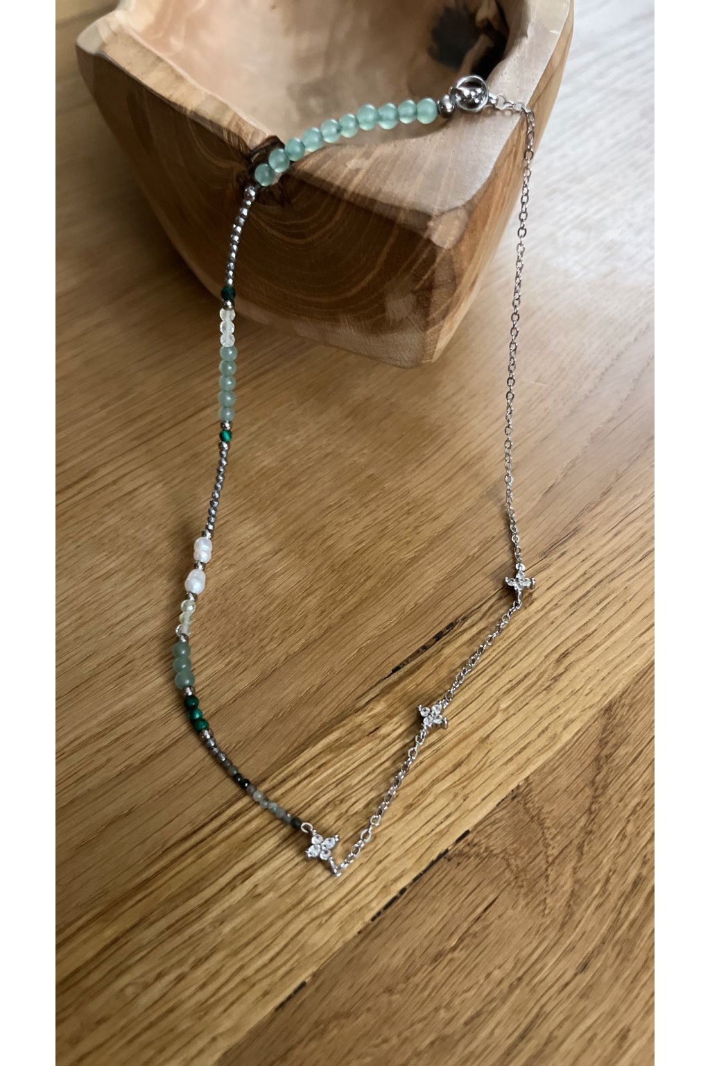 Dámský náhrdelník z minerálů - Smaragd 2 mm, Hematit 2 mm, Malachit 3 mm, Prehnit 3 mm, říční perly 4-5 mm, Zelený Avanturín 4 mm, stříbrný řetízek s kytičkami se zirkony - ocel