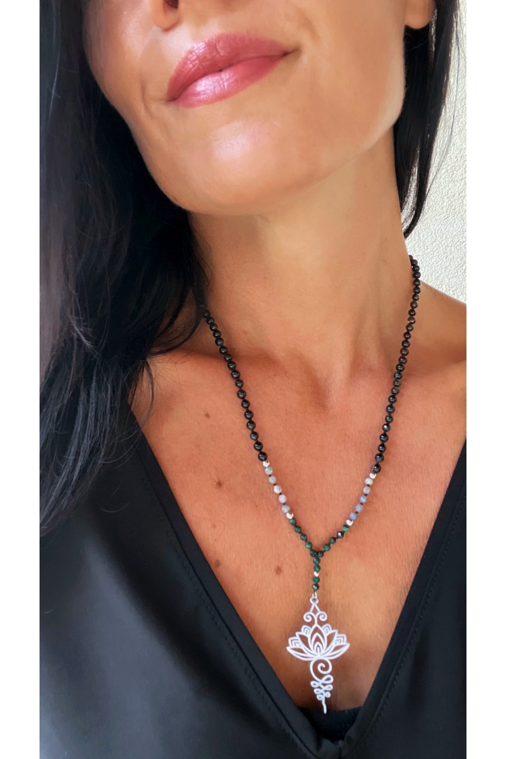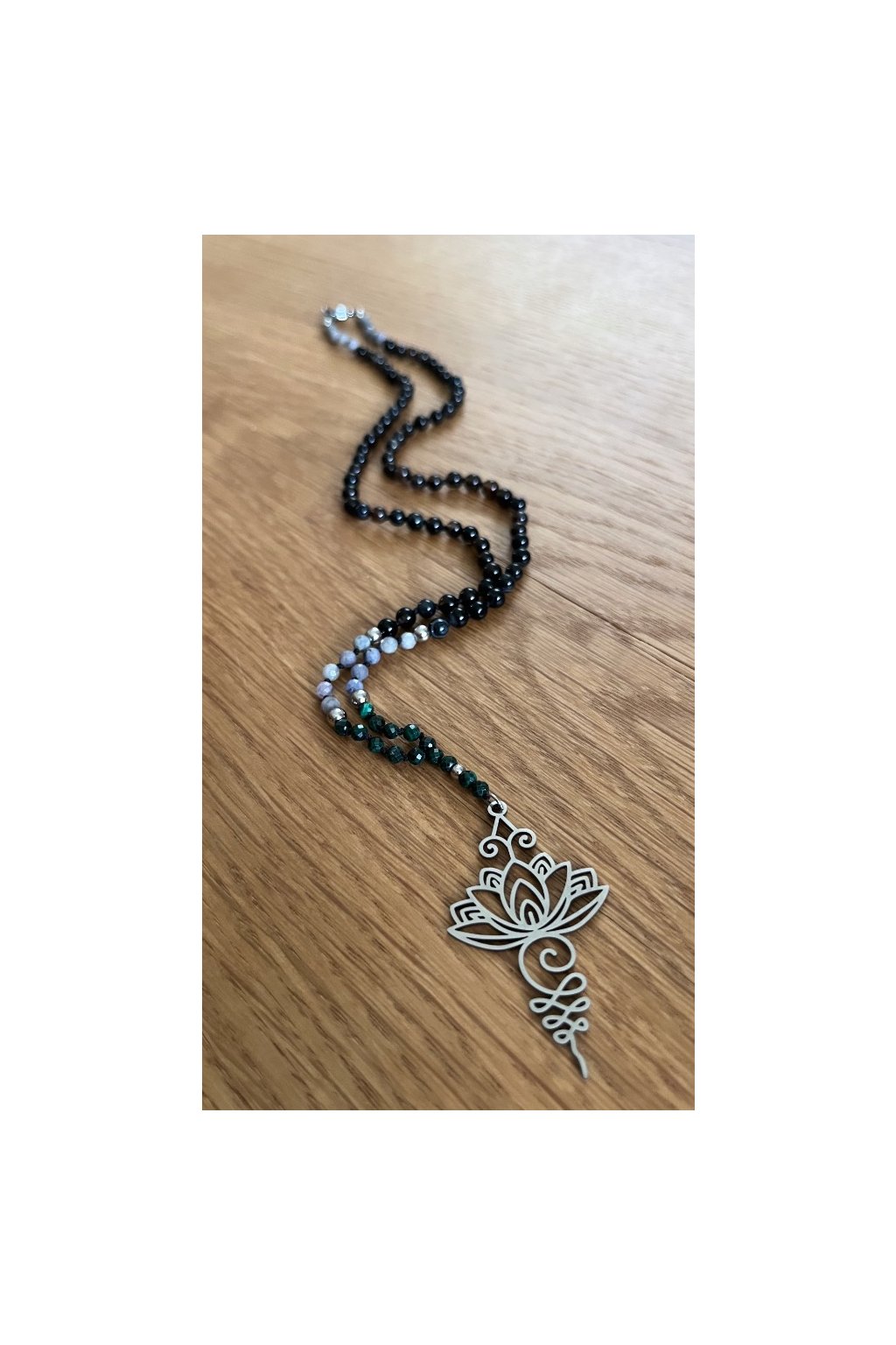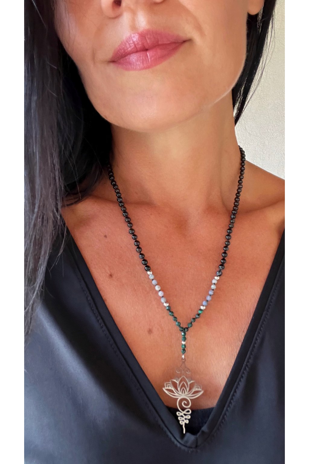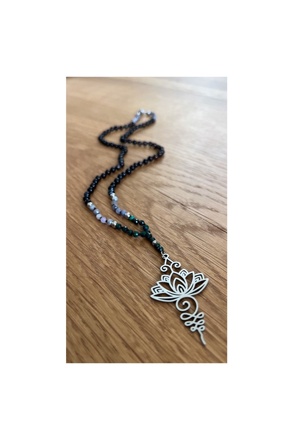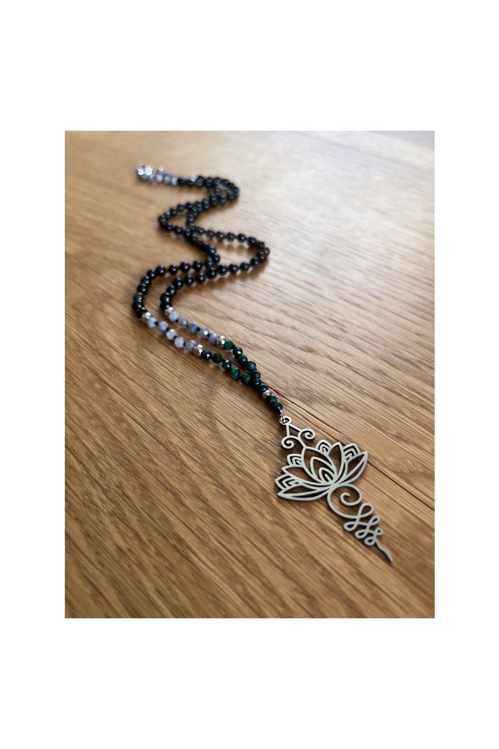 Dámský náhrdelník z minerálů - Malachit, Tanzanit 3 mm, Černý Achát 4 mm, Lotosový Květ