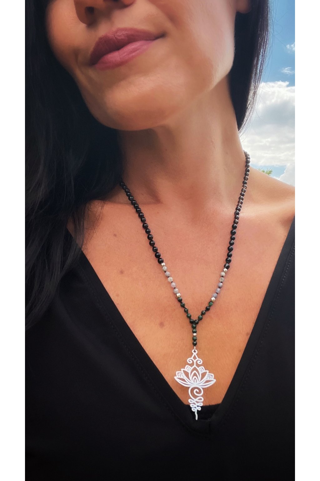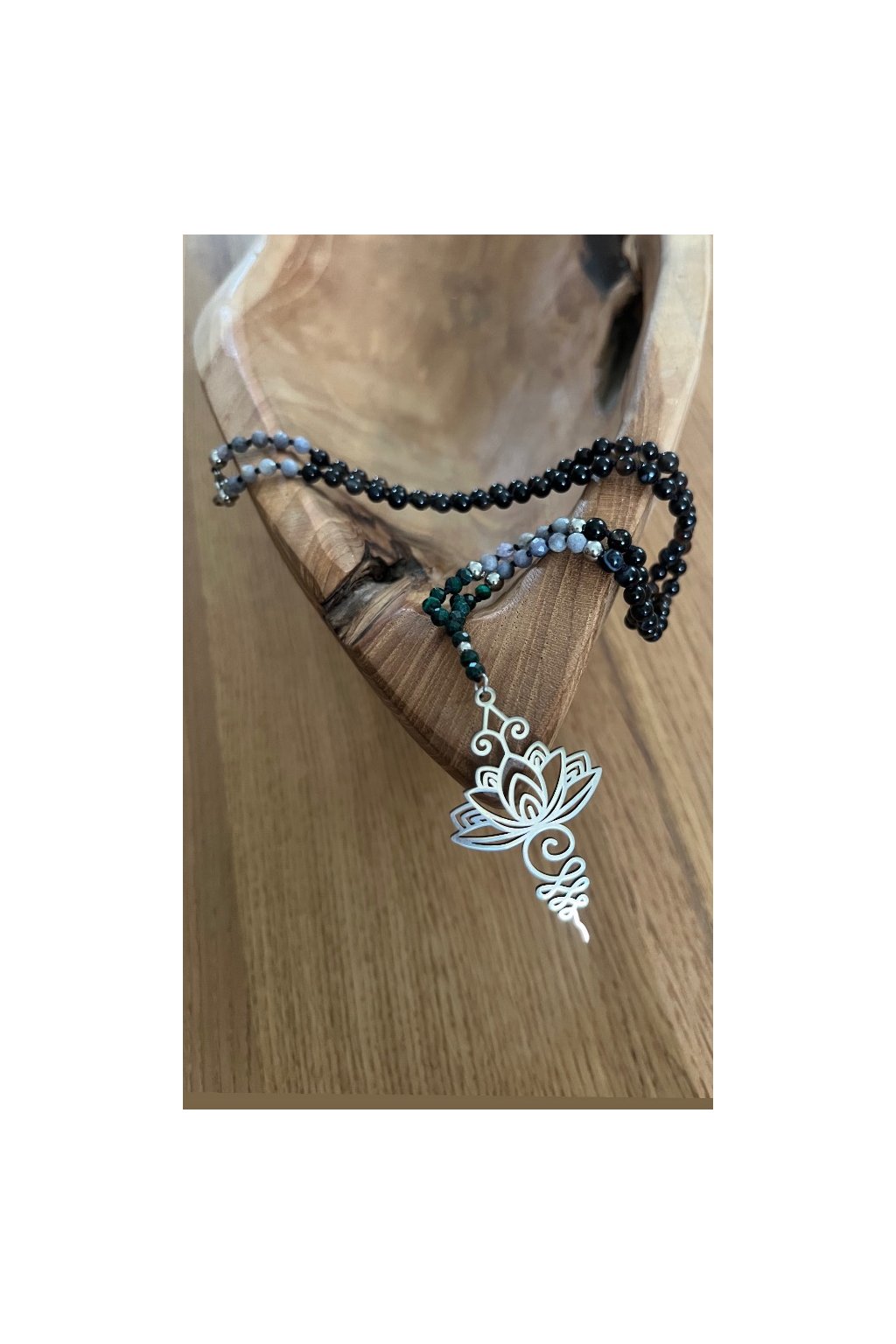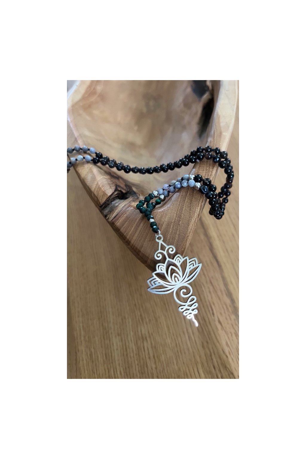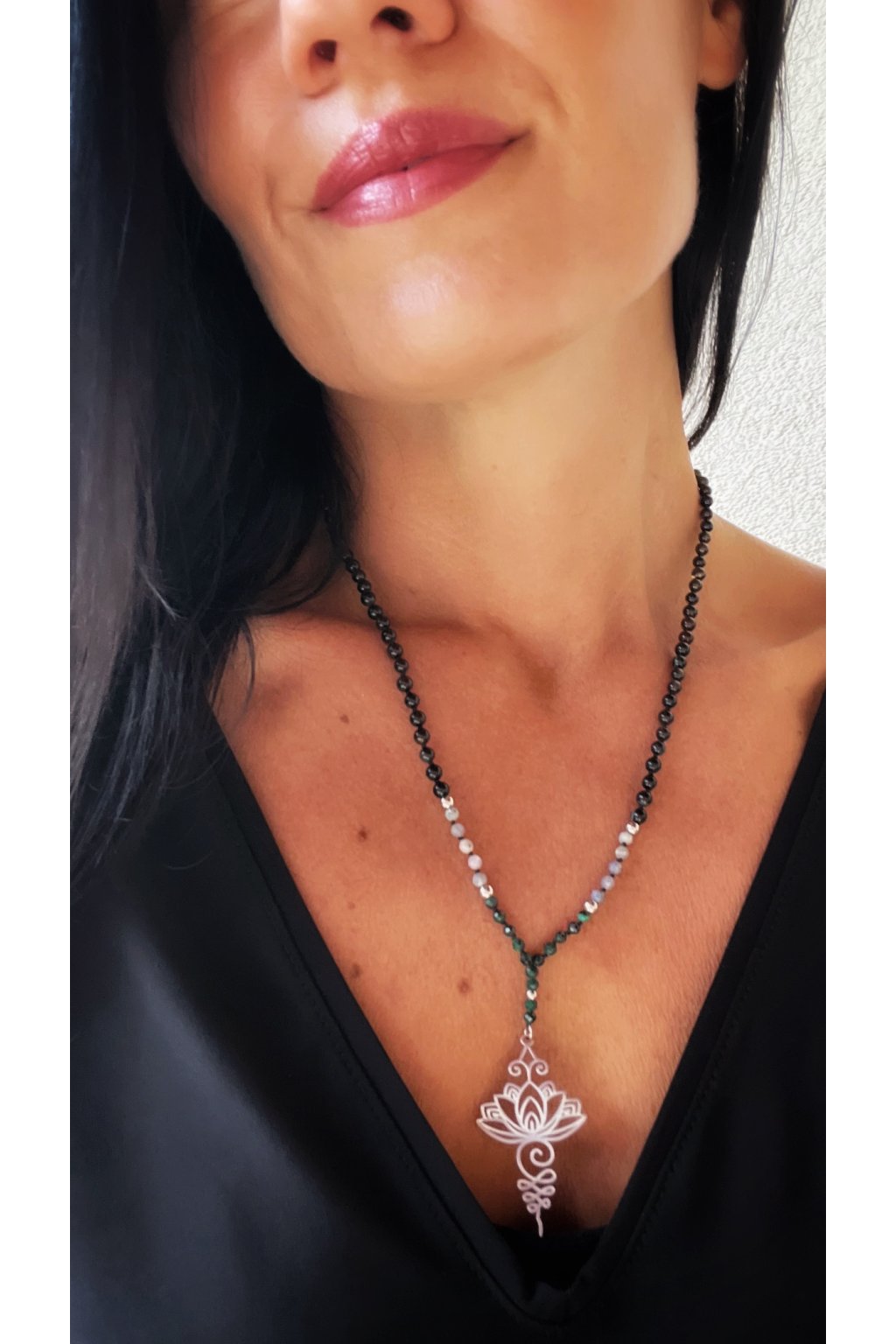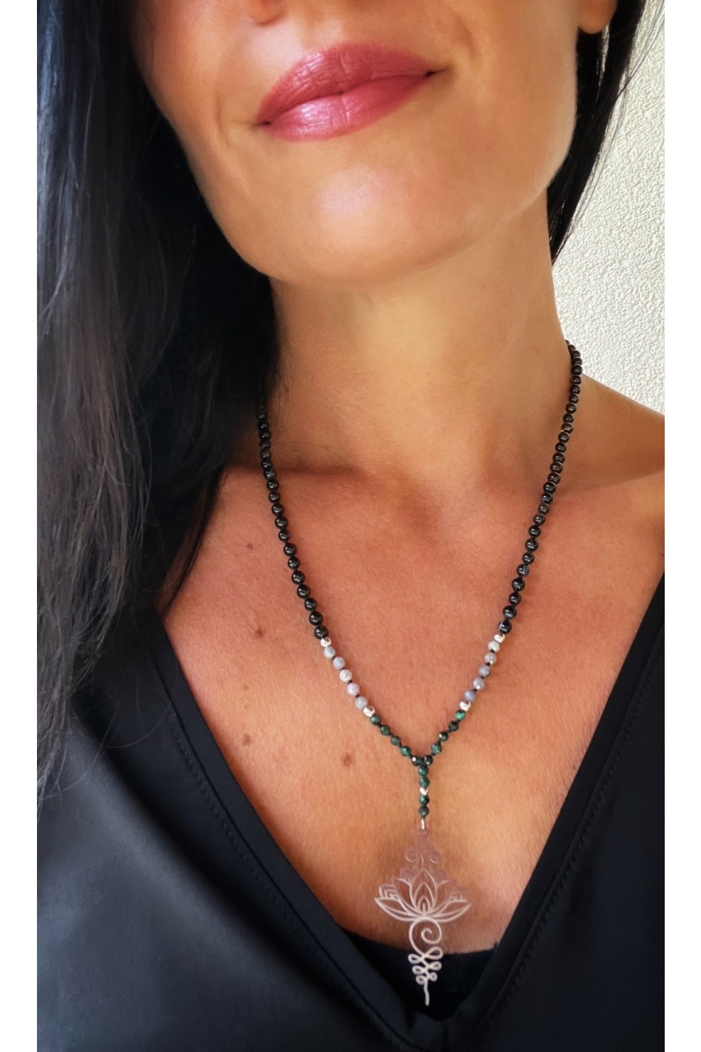 Dámský náhrdelník z minerálů - Malachit, Tanzanit 3 mm, Černý Achát 4 mm, Lotosový Květ