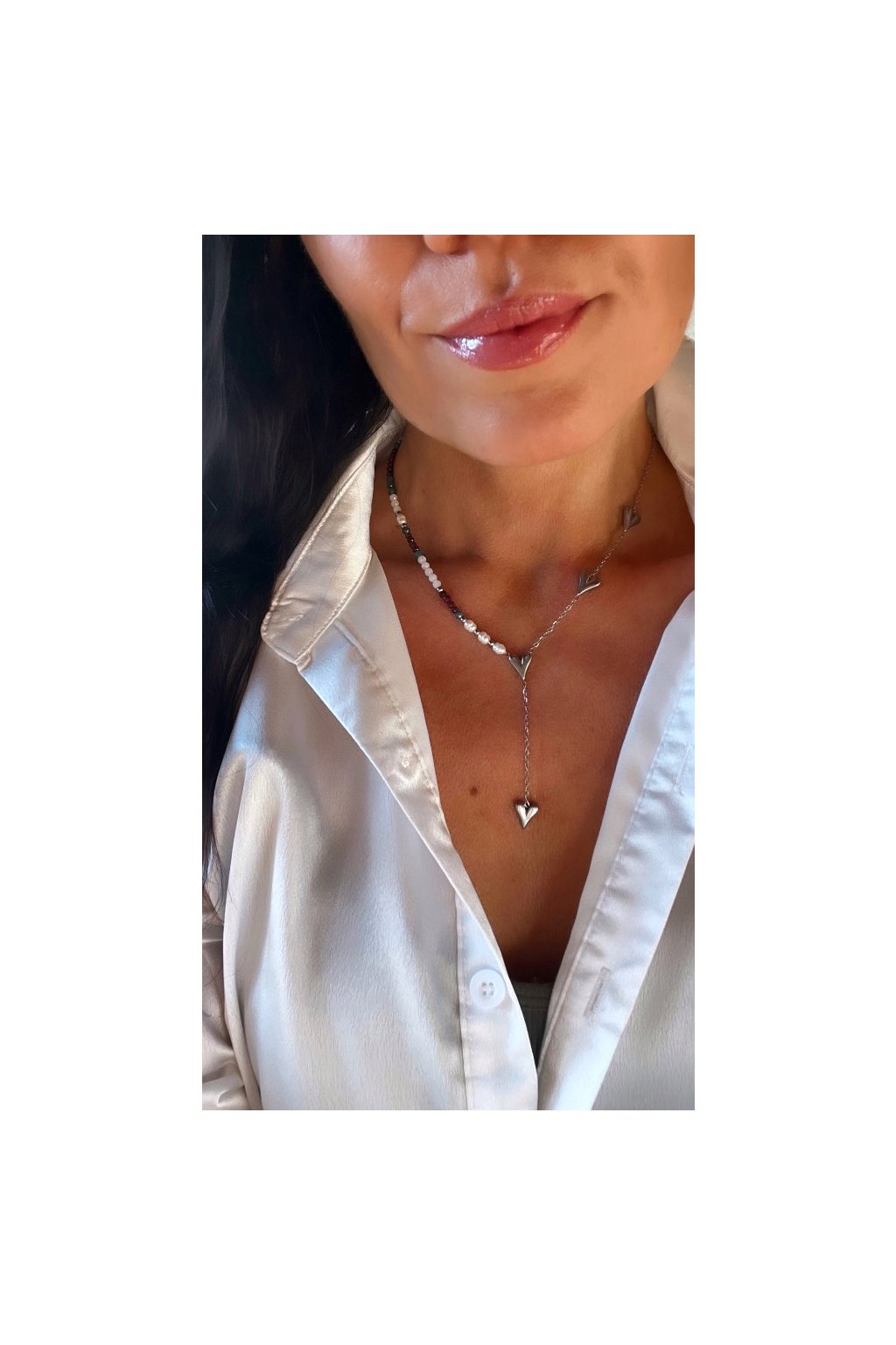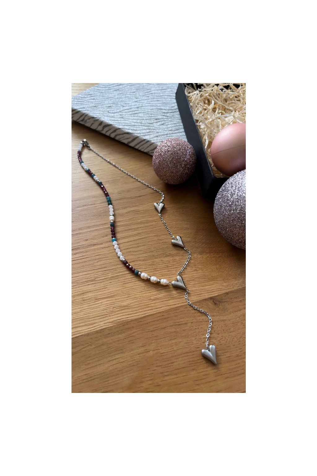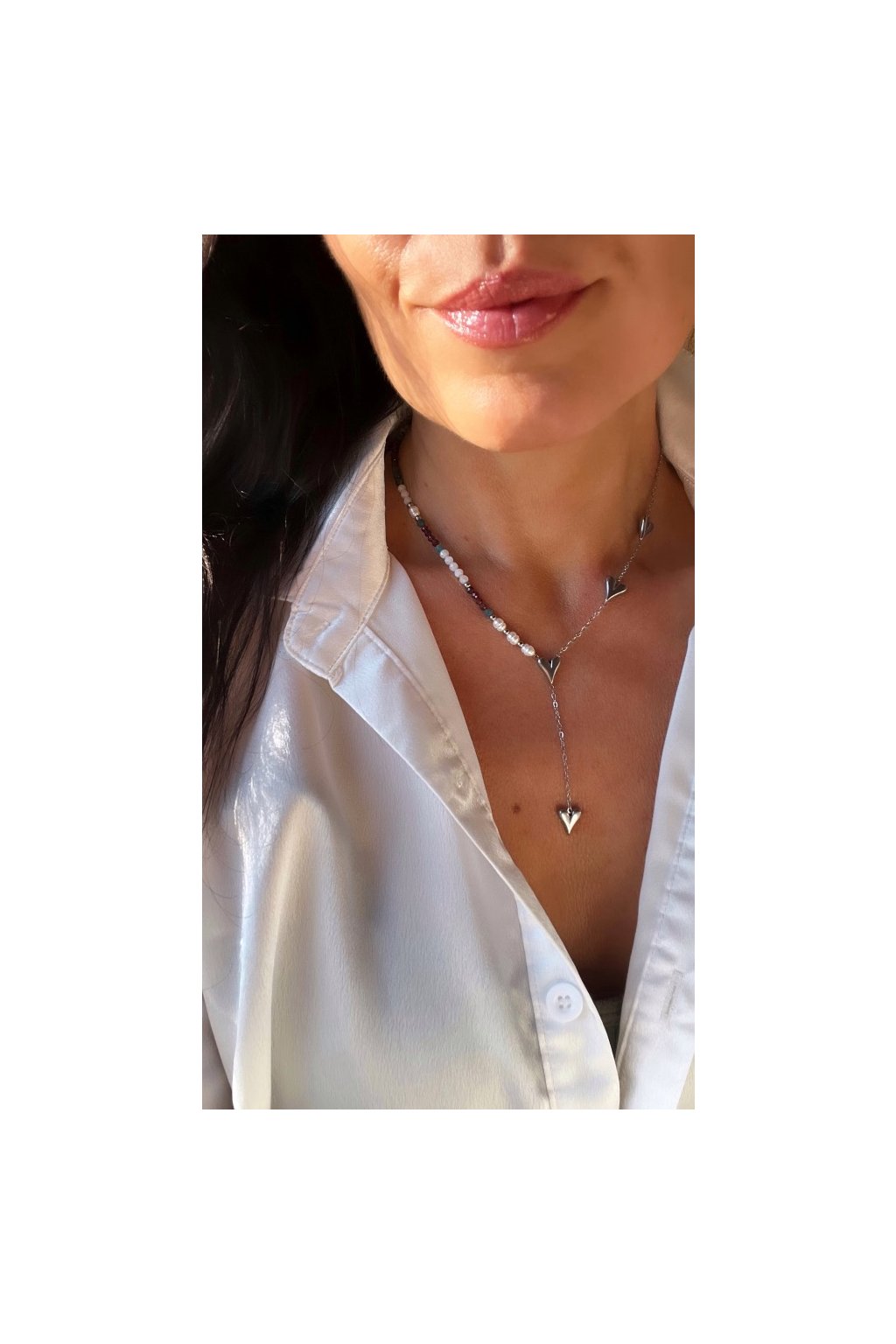 Dámský náhrdelník z minerálů - Měsíční kámen, Apatit, Granát 3mm, Říční perly 4-5mm, Řetízek se srdíčky stříbrný - ocel