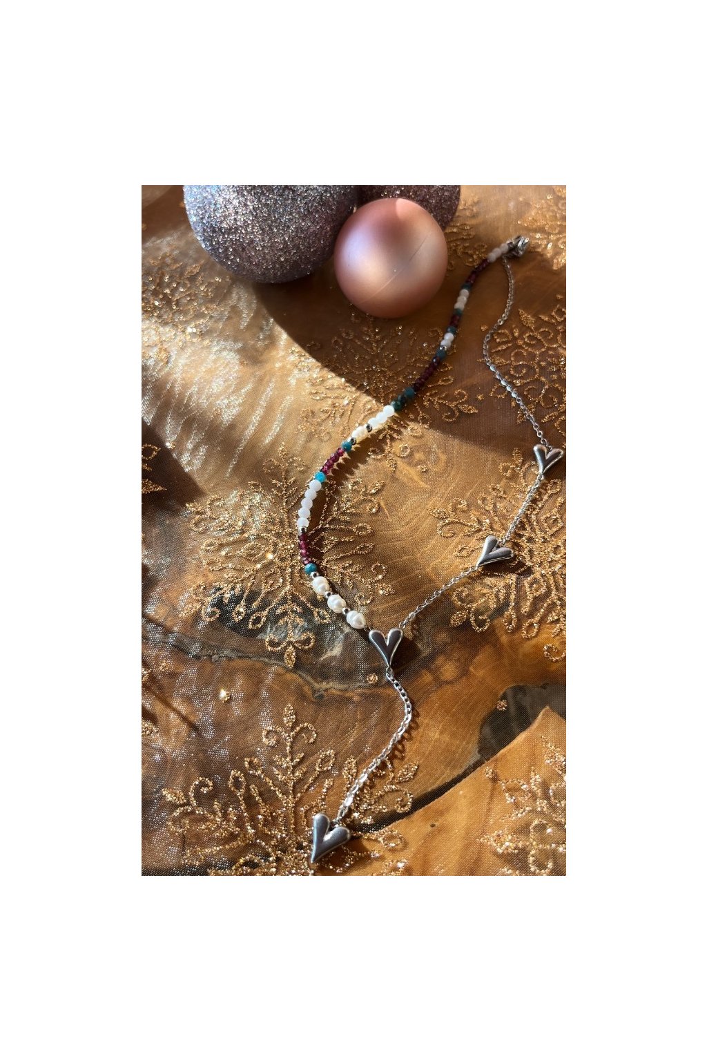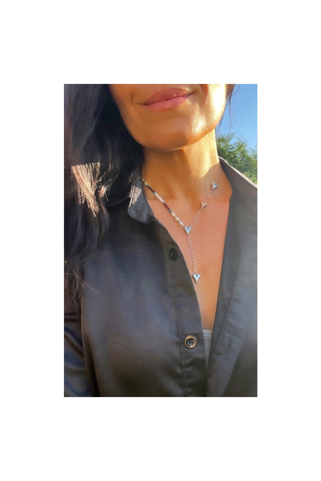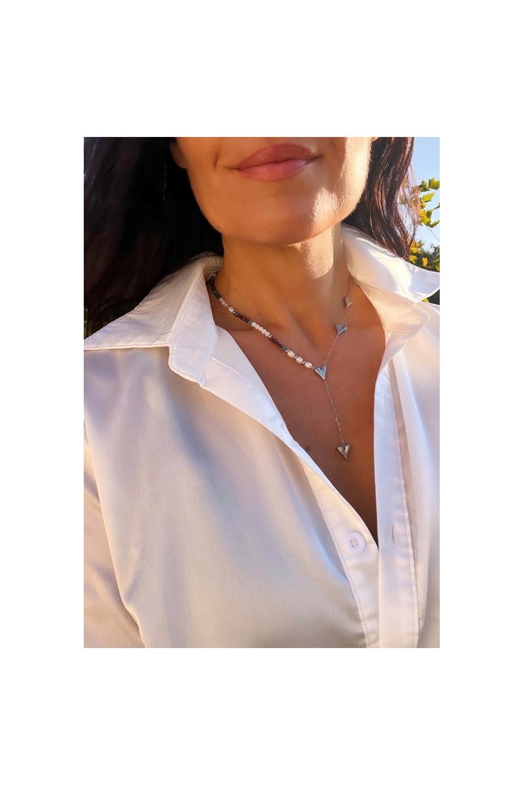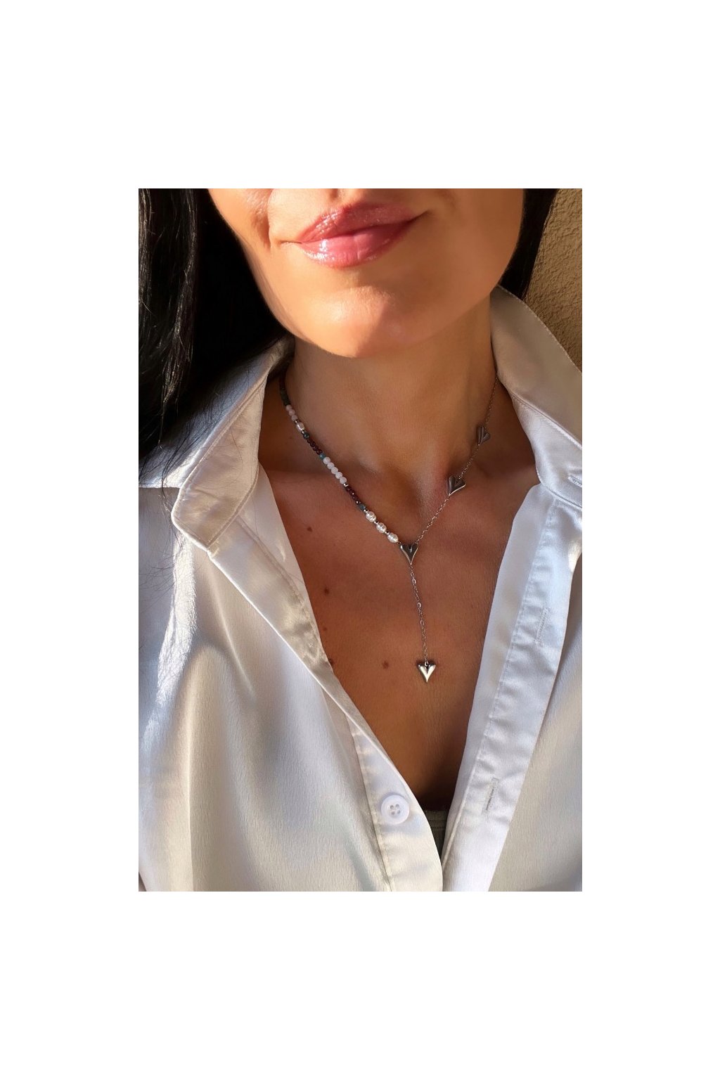 Dámský náhrdelník z minerálů - Měsíční kámen, Apatit, Granát 3mm, Říční perly 4-5mm, Řetízek se srdíčky stříbrný - ocel