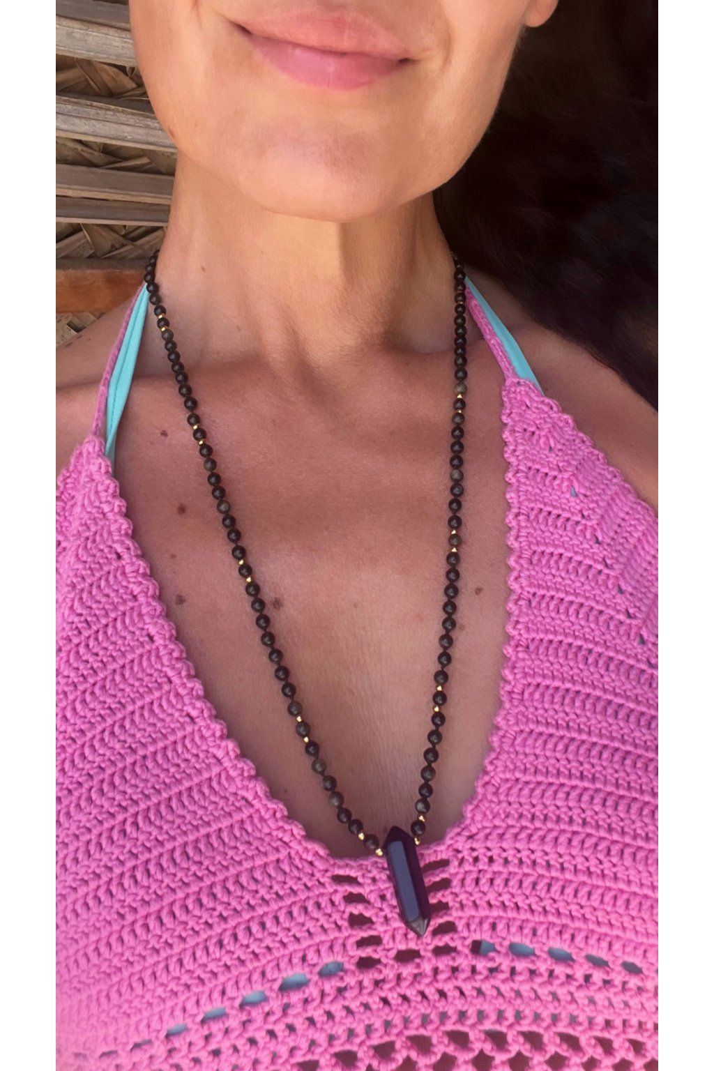 Dámský náhrdelník z minerálů - Obsidián 4 mm, přívěšek Hexagon Obsidián